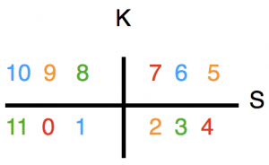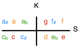 Eines der bisher ungelösten Schismen der Musiktheorie betrifft die Versuche, den Molldreiklang aus dem in der Obertonreihe vorgebildeten Durdreiklang abzuleiten. Durch die Implementierung der Achsen K und S in den Zwölftonraum wird das Problem mathematisch und geometrisch einfach und einwandfrei gelöst: Dur- und Molldreiklänge werden sowohl unter K als auch unter S aufeinander abgebildet. Die Abbildungsformeln lauten: 3 – x = K(x); 9 – x = S(x). Dies lässt sich anhand der nachfolgenden Diagramme nachvollziehen: C-Dur (rot) wird unter S auf d-Moll (orange) und unter K auf as-Moll (grün) abgebildet; as-Moll unter S auf Fis-Dur (blau). Die Grundtöne der Durtoniken liegen abstrakt auf den Zahlenwerten 0 und 6.